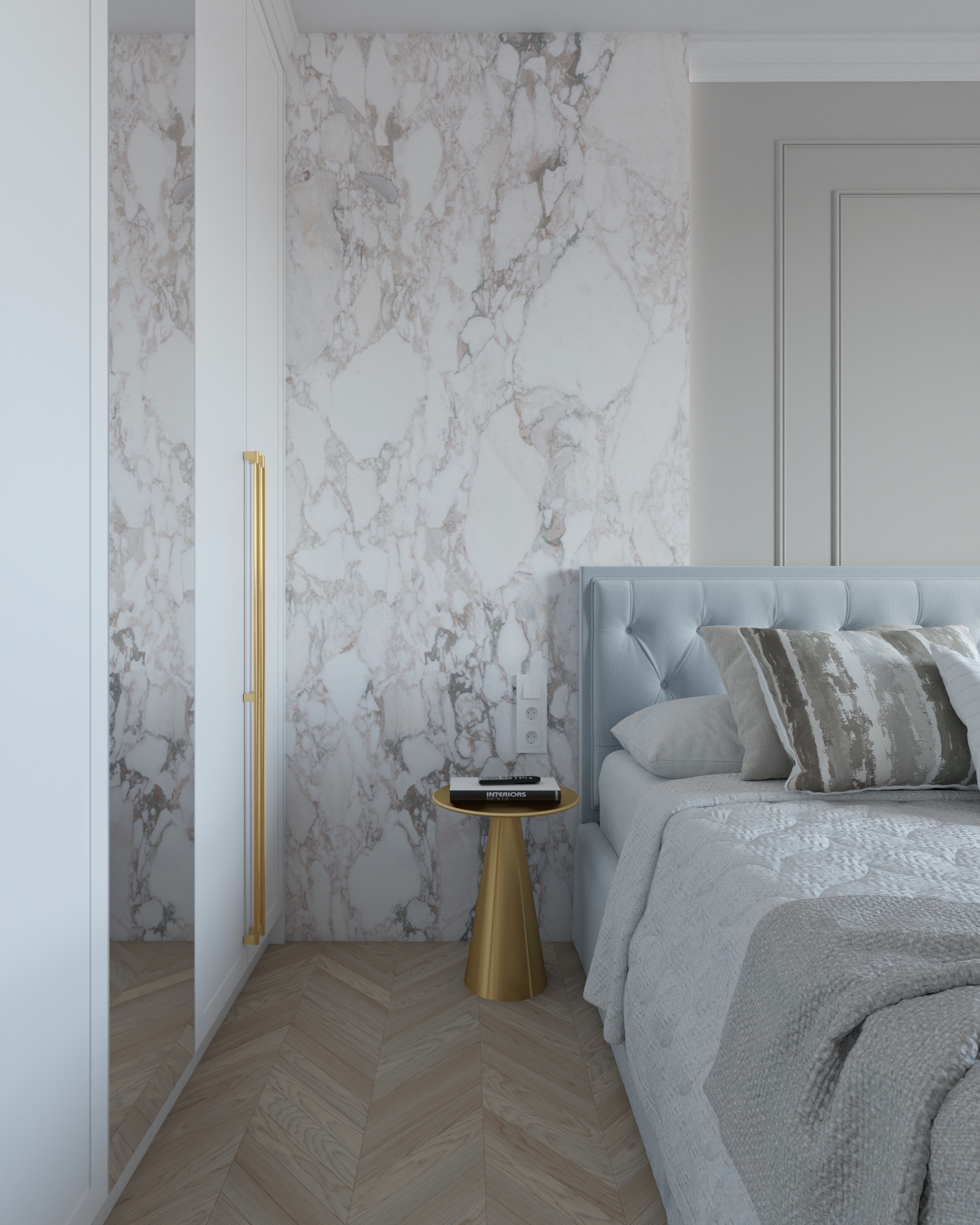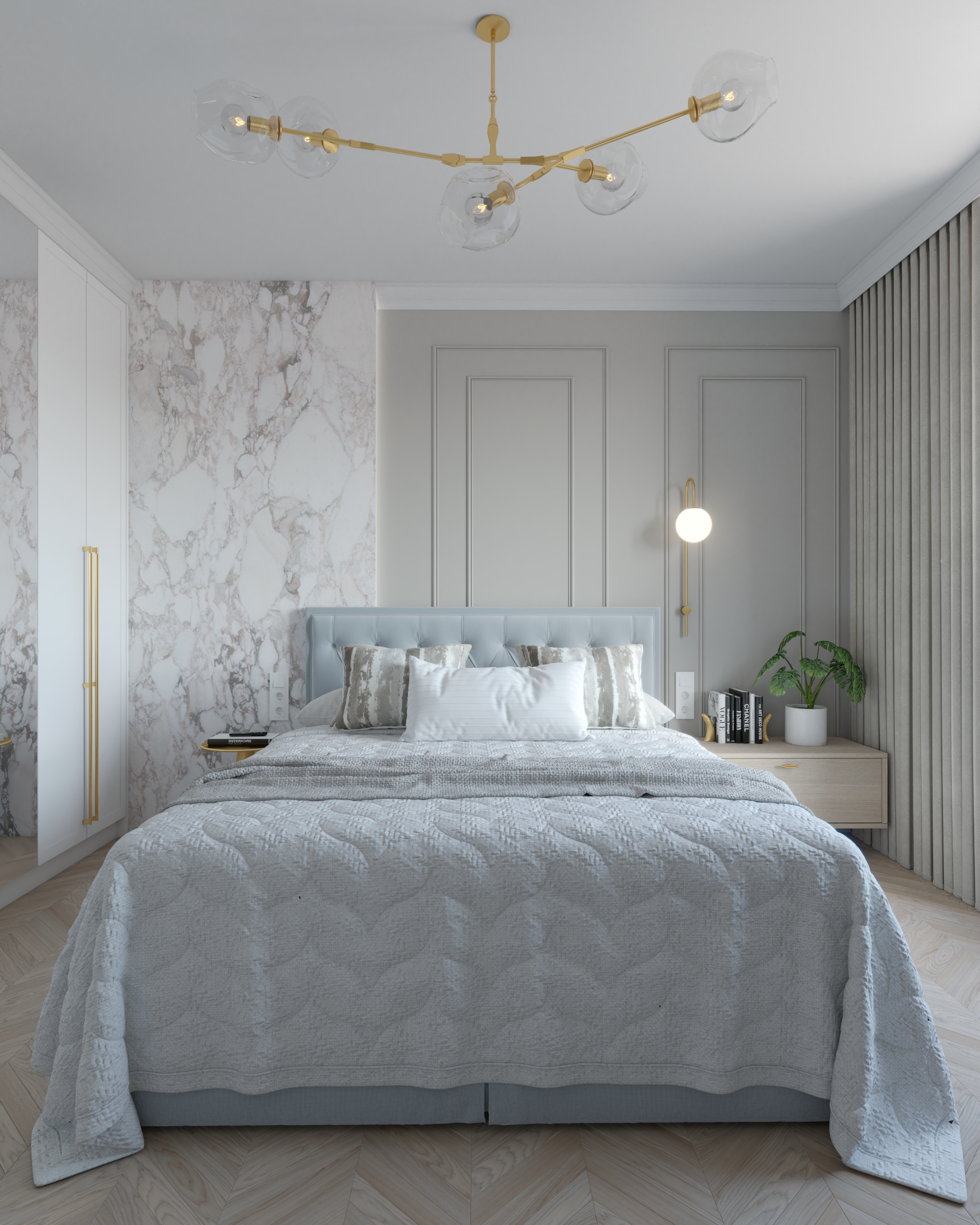 Sypialnia „Classic Blue” to esencja klasyki w połączeniu z nowoczesnymi trendami. Projekt oferuje harmonijne połączenie bieli, beżów i błękitów, dopełnione złotymi akcentami i marmurowymi ścianami. Jest to idealne rozwiązanie dla osób szukających gotowego projektu, który pozwoli stworzyć w domu przestrzeń pełną spokoju, elegancji i luksusu.