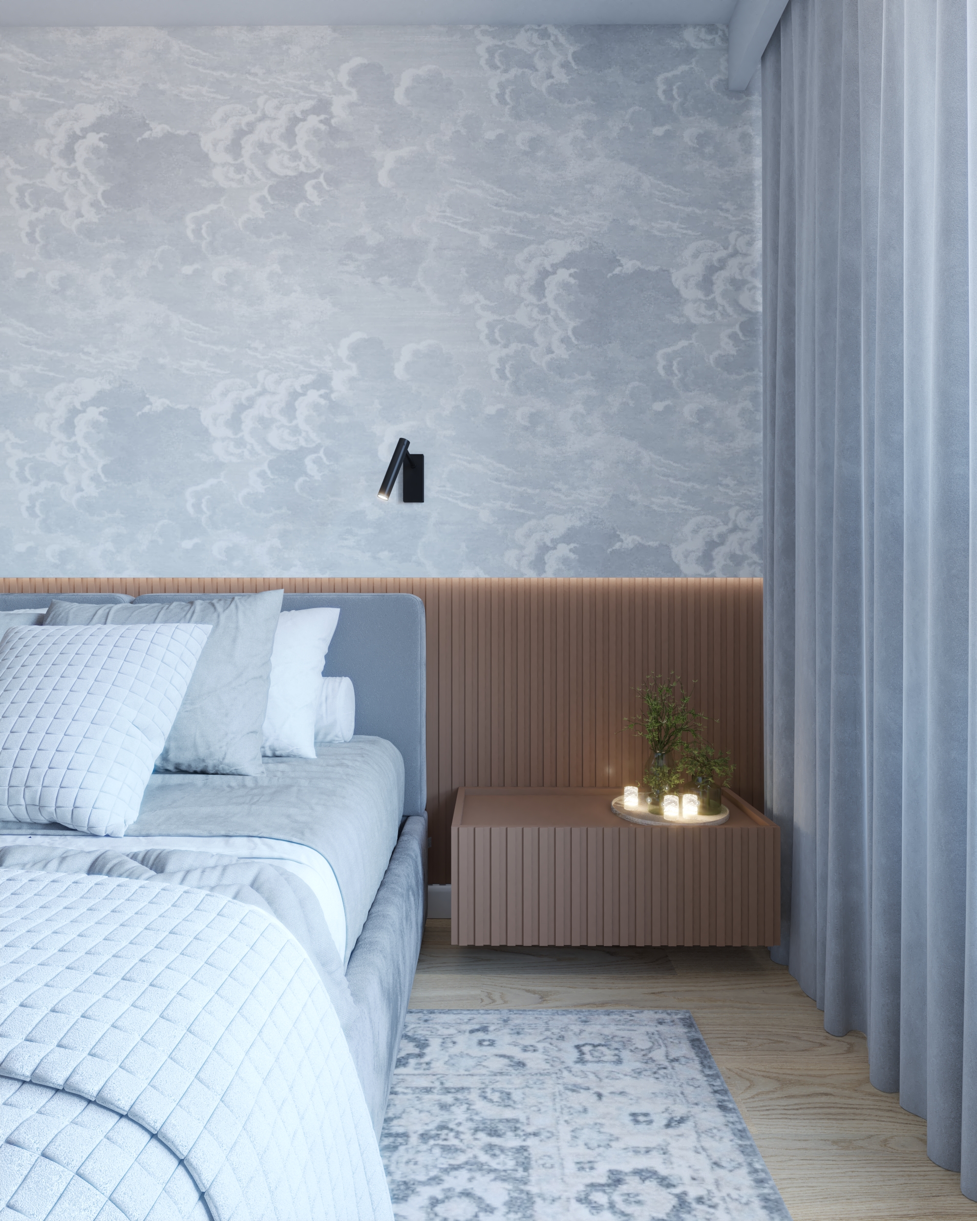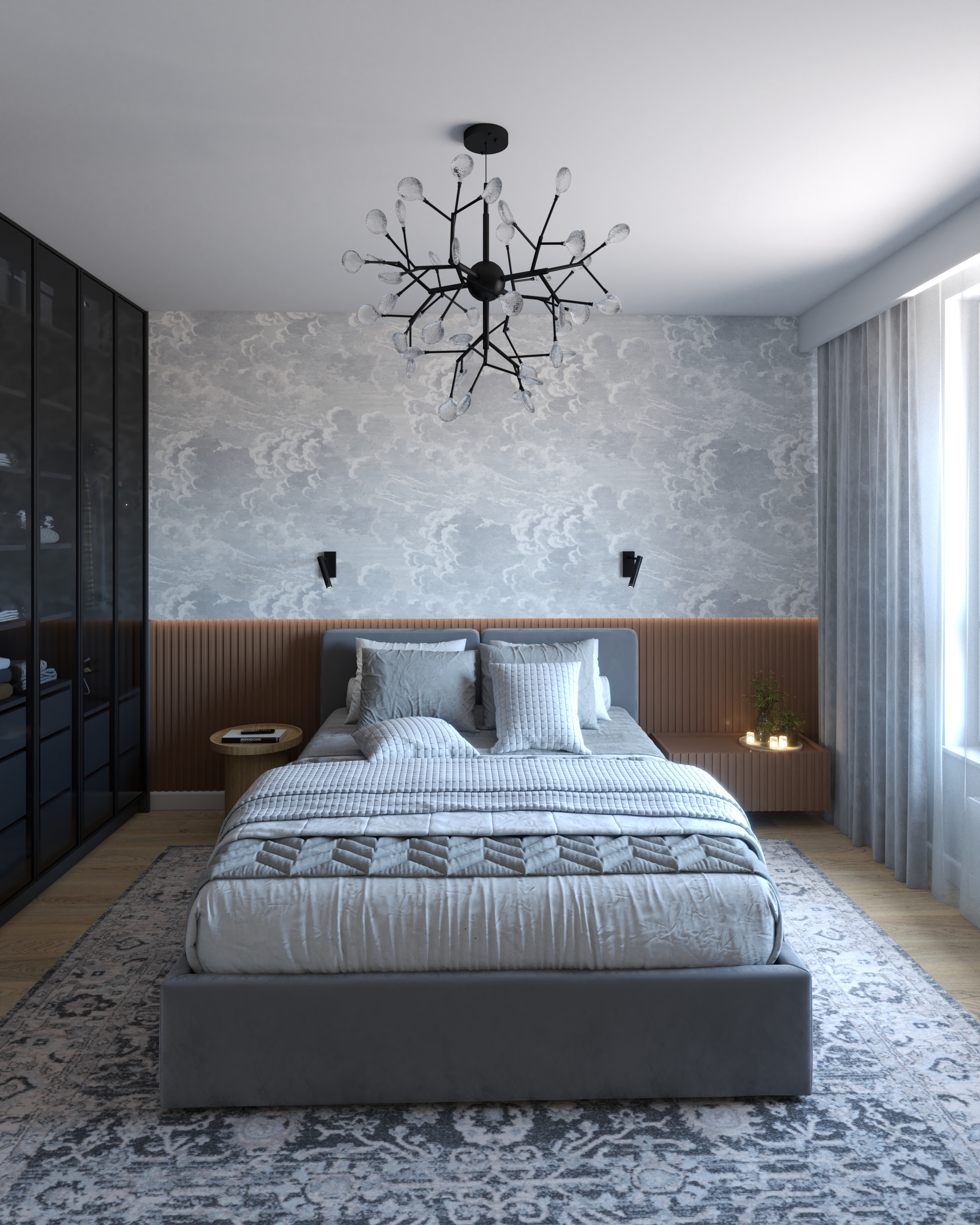 Projekt sypialni „Orange Vibe” to kwintesencja nowoczesnego designu, łączącego w sobie elegancję i ciepło domowego zacisza. Został on stworzony z myślą o osobach poszukujących inspiracji do wykończenia lub odnowienia wnętrza sypialni. Charakteryzuje się stonowaną paletą kolorystyczną, z dominującymi odcieniami szarości i akcentami w kolorze ciepłego drewna. Zróżnicowanie tekstur – od gładkich, matowych powierzchni po delikatne, tkaninowe obicia – dodaje wnętrzu głębi i wyrafinowania. Starannie dobrane oświetlenie, w postaci centralnego, designerskiego żyrandola, tworzy przytulną atmosferę. Projekt obejmuje funkcjonalne rozwiązania przechowywania, takie jak przestronna, szklana garderoba, która łączy w sobie estetykę z praktycznością.